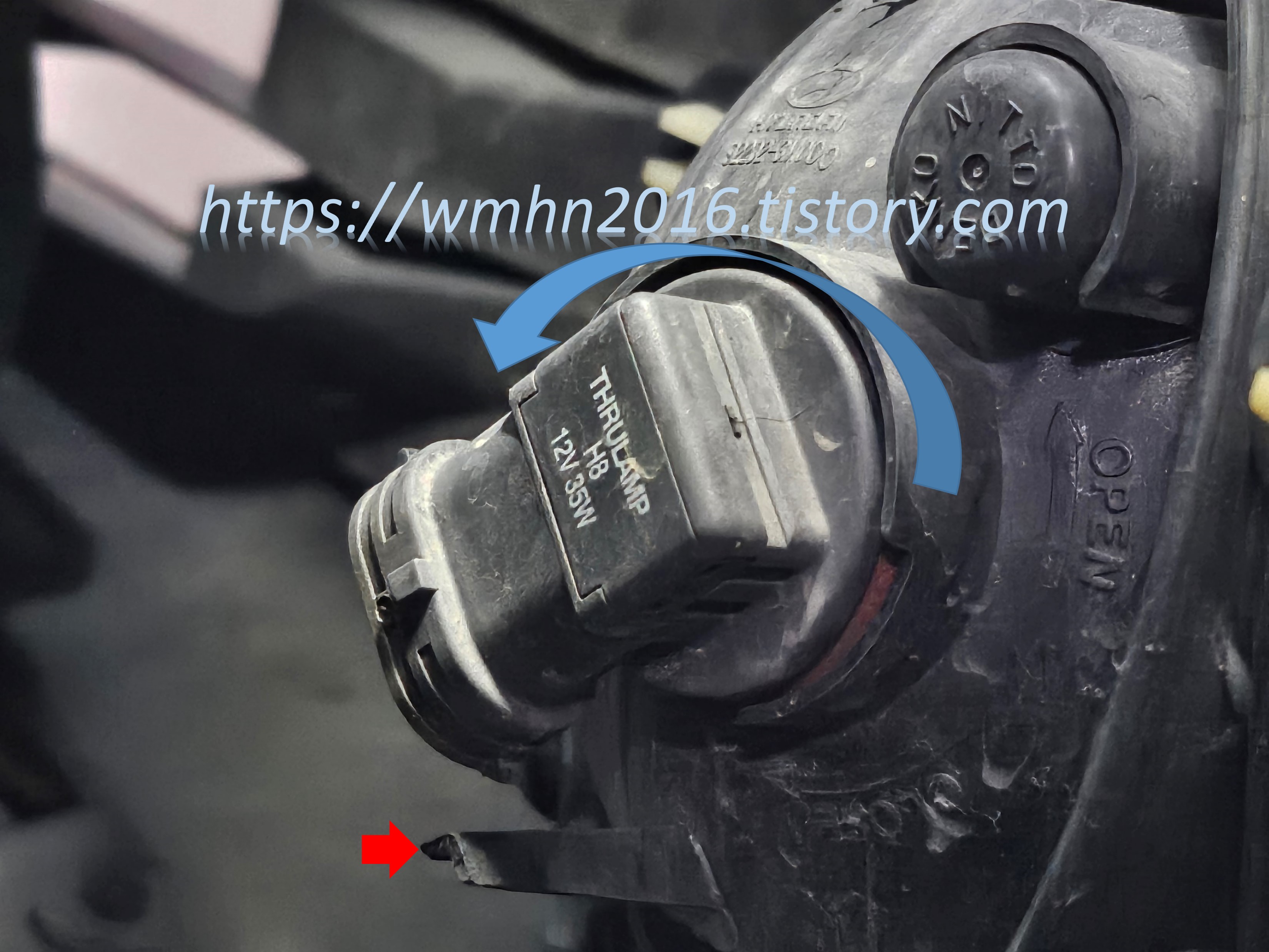 기존 안개등은 아래와 같이 시계 반대방향으로 돌리면 쉽게 분리할 수 있습니다. 만약, 커넥터가 연결된 상태로 안개등을 분리하려고 하면 아래 빨간색 화살표가 가리키는 가이드로 인해 안개등이 분리되지 않을 수 있으니 참고하세요.