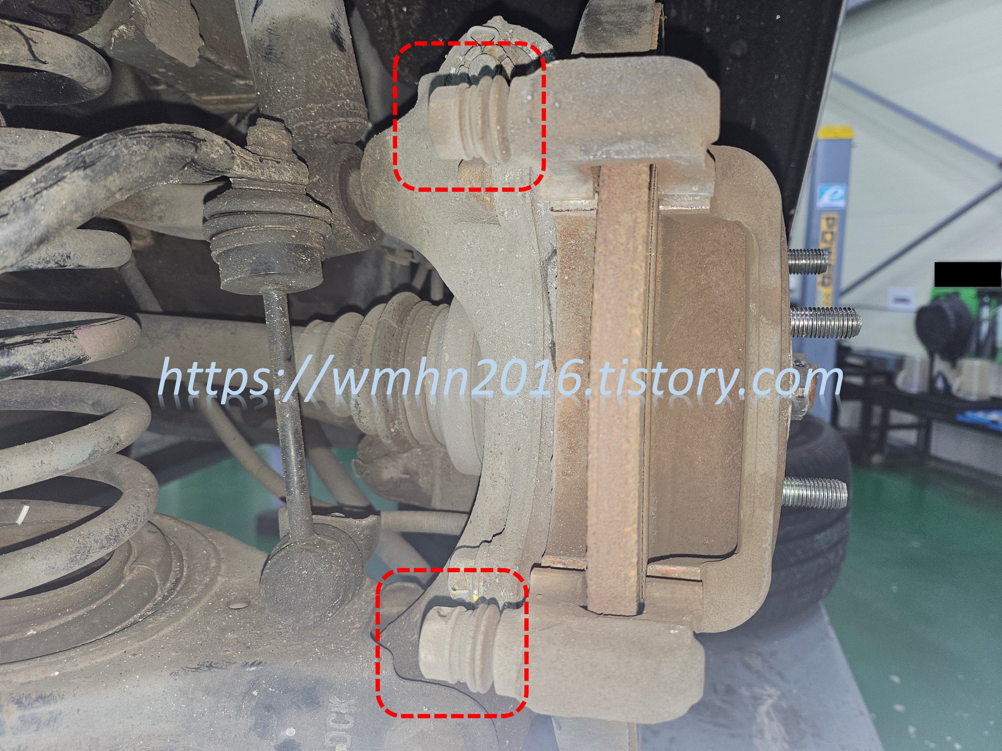 캘리퍼 분리를 한 후 보면 캘리퍼 1개마다 가이드 로드와 고무부트가 2쌍씩 있습니다.