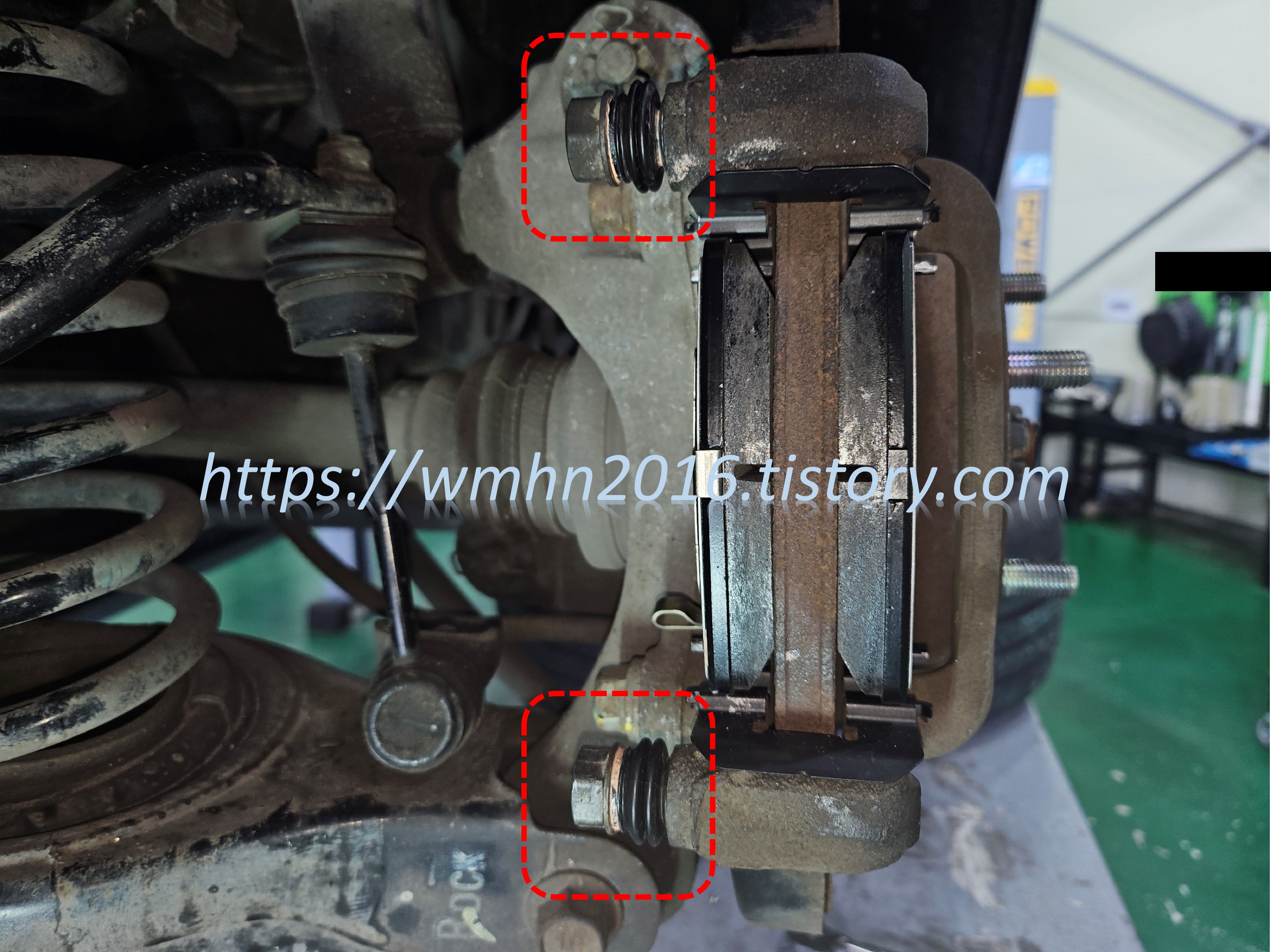 캘리퍼 가이드핀 윤활작업을 위해서 차량 바퀴를 탈거하고 캘리퍼를 분리하여야 합니다. 방법은 아래 링크를 참고하세요