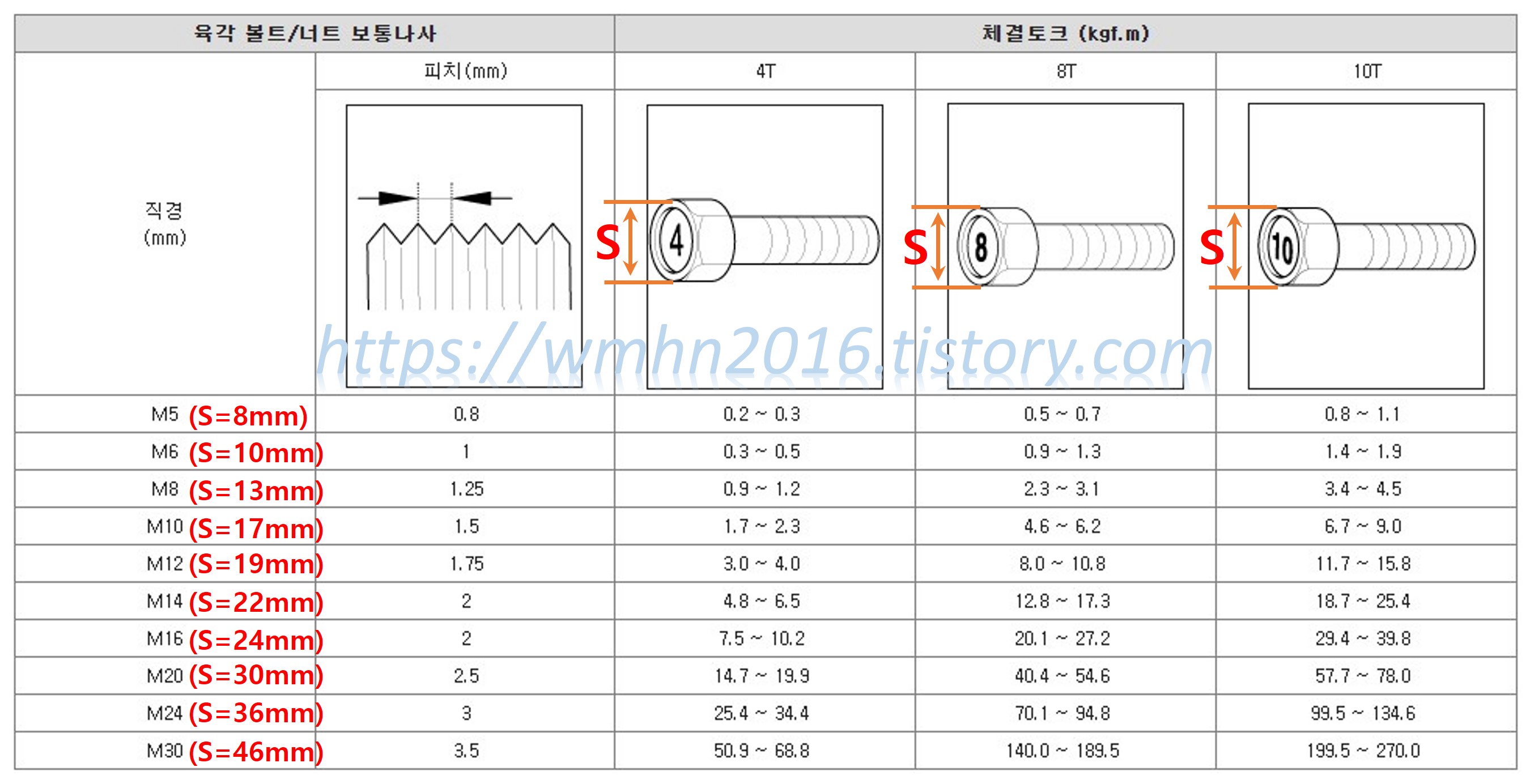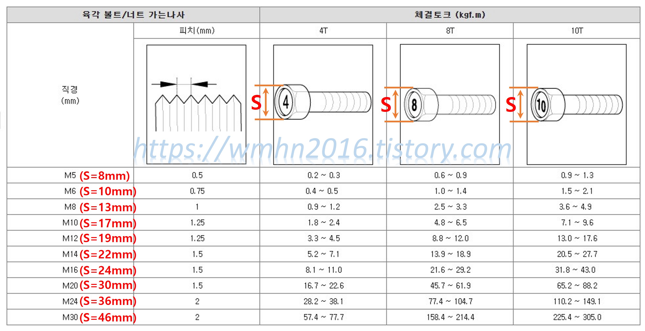 볼트 및 너트의 일반조임 토크는 아래의 기준에 따라 적용하여야 합니다.